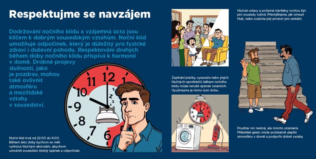 Brožura obsahuje popis častých situací, se kterými se mohou sousedé setkávat. Upozorňuje na důležitá témata právě od úklidu společných prostor po dodržování nočního klidu. Snahou sociálních pracovníků je mluvit o těchto tématech v rámci prevence. Zároveň při řešení vzniklých situací mluvíme s nájemníky i pronajímateli tom, že každý člověk je jedinečný a každý má individuální hranici tolerance a co vadí jednomu nemusí vadit druhému.
