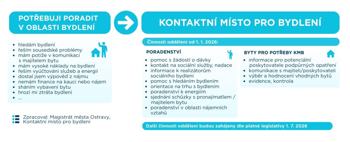 V souvislosti s účinností Zákona o podpoře bydlení vzniká po celé České republice síť 154 kontaktních míst pro bydlení. K 1. lednu 2026 také Magistrát města Ostravy zahájil v rámci odboru sociálních věcí a zdravotnictví činnost nového oddělení – kontaktního místa pro bydlení (KMB).